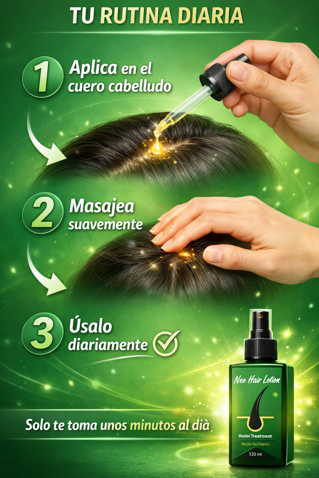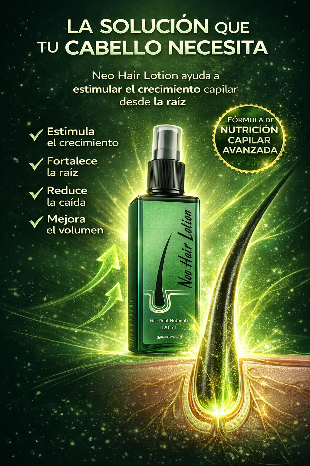 Su fórmula avanzada actúa directamente en el cuero cabelludo, fortaleciendo los folículos capilares y ayudando a reducir la caída progresiva del cabello, mientras estimula un crecimiento más fuerte, saludable y abundante.