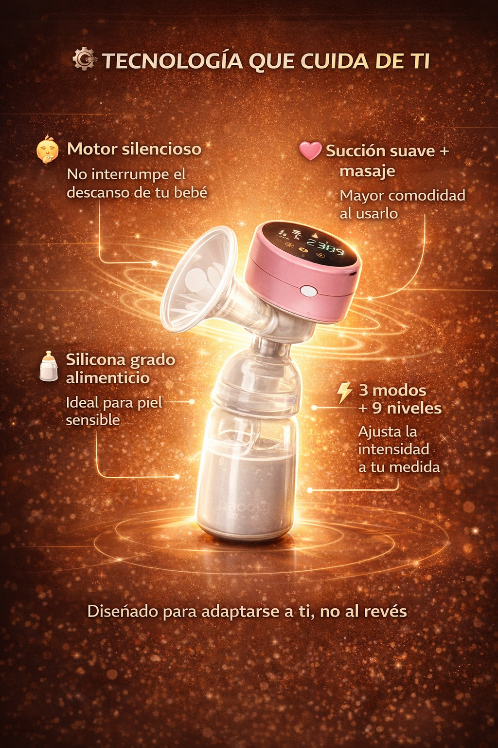 Utiliza tecnología de succión inteligente que imita el ritmo natural de succión del bebé, combinando masaje y extracción para lograr un proceso más cómodo, eficiente y sin dolor.